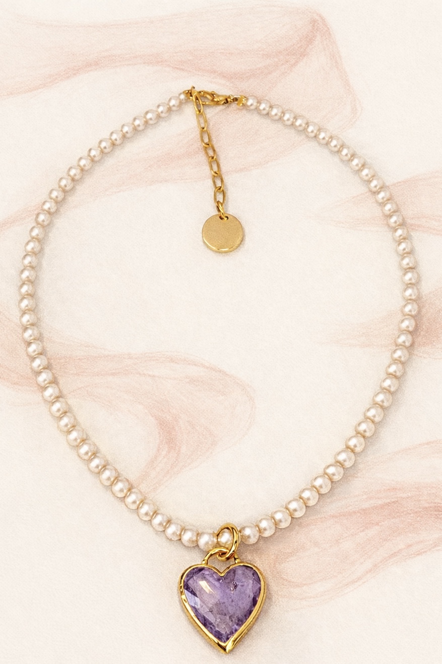 Zarif tasarımı ve doğal taşların büyüleyici uyumuyla dikkat çeken Sofya kolye, feminen şıklığı ön plana çıkarır. İnci dokusu ve kalp formundaki ametist taşıyla romantik ve anlamlı bir stil sunar.